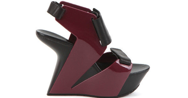 This molded futurist cantilevered wedge has three adjustable leather straps. The Velcro fastening on all three straps makes this shoe fully adjustable and has a rubber textured outsole for grip. Designed in the Netherlands by architect Rem Koolhaas.